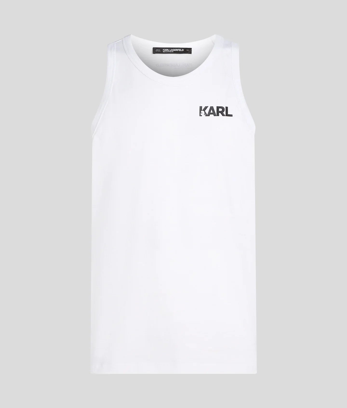 An ultra-lightweight beach tank top featuring a comfortable sleeveless design and a classic crew neck. The prominent KARL logo at the chest adds a statement touch, perfect for sunny days by the water.