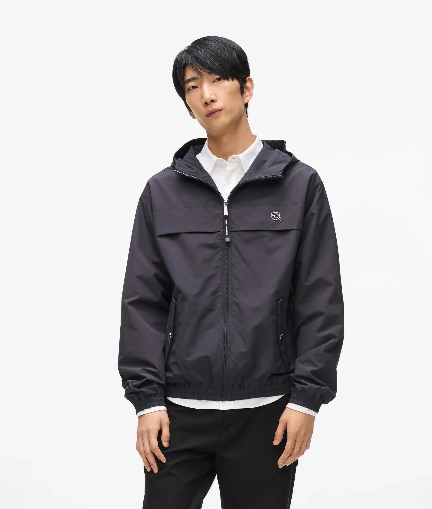 Move through seasons with ease in this lightweight jacket. The hooded silhouette offers effortless layering while snap pockets keep essentials close. A subtle metal Ikon Karl pin adds a playful finish.