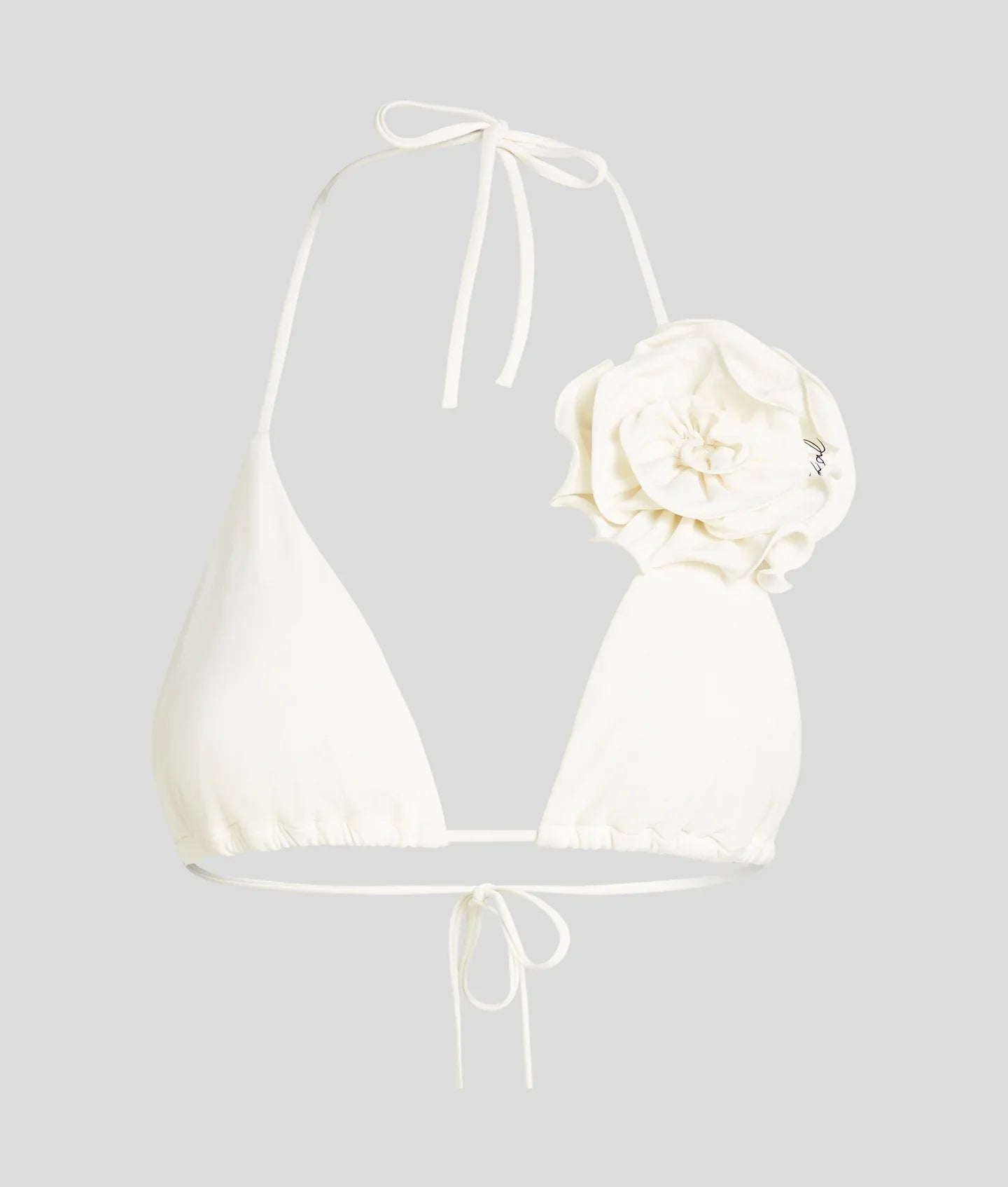 A striking addition to any swimwear collection, this bikini top features adjustable halter-neck straps for a customized fit and a charming detachable flower adornment. The KARL Signature logo adds a touch of flair, perfect for mixing and matching with coordinating pieces.