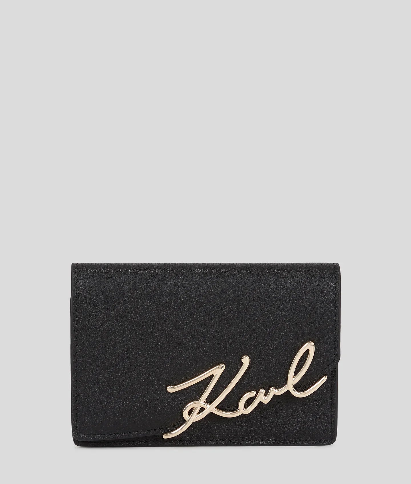 Crafted from smooth leather, this sophisticated wallet features a secure flap closure adorned with delicate Karl Signature hardware. Multiple card slots offer practical organization, making it an essential and elegant accessory.