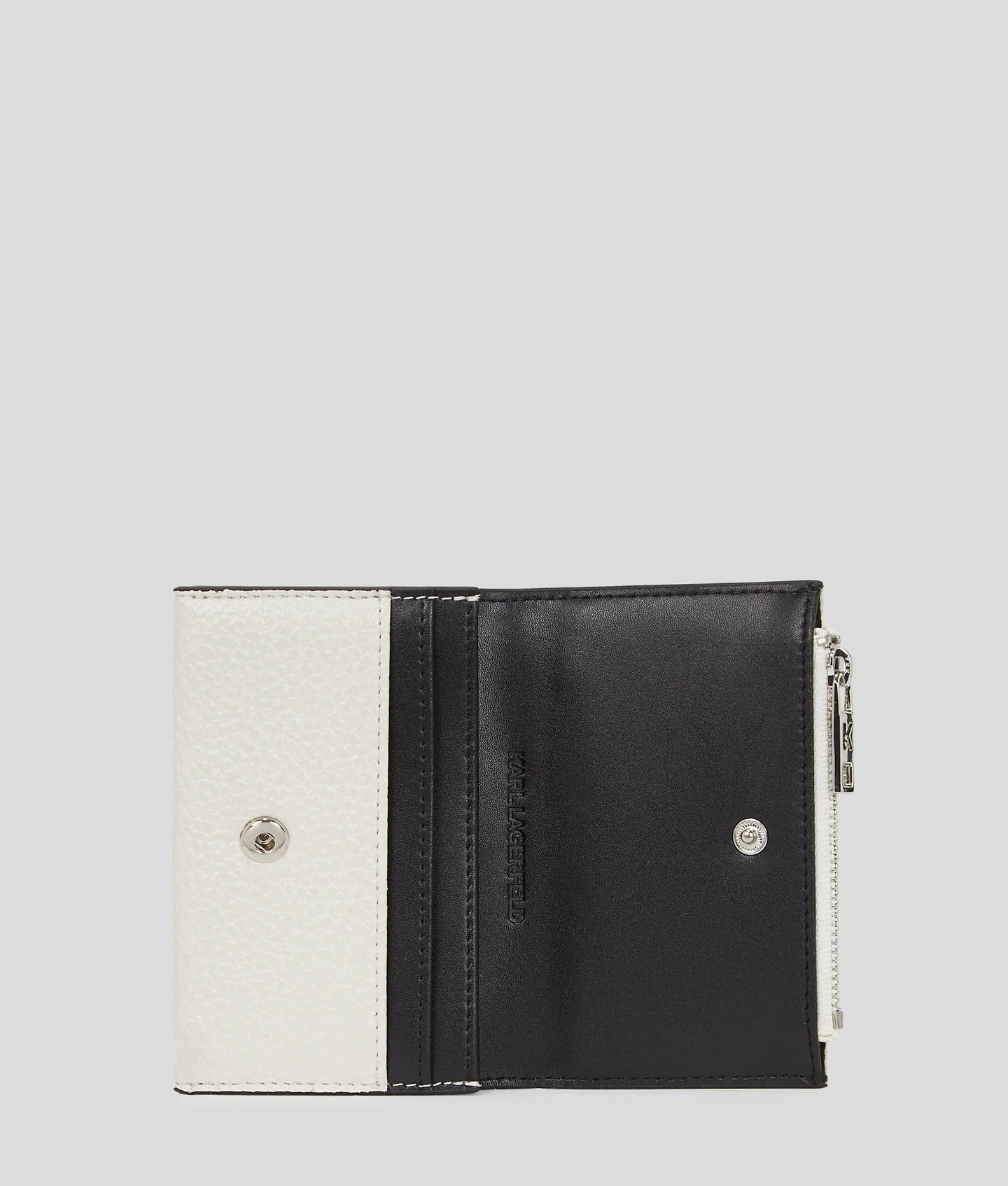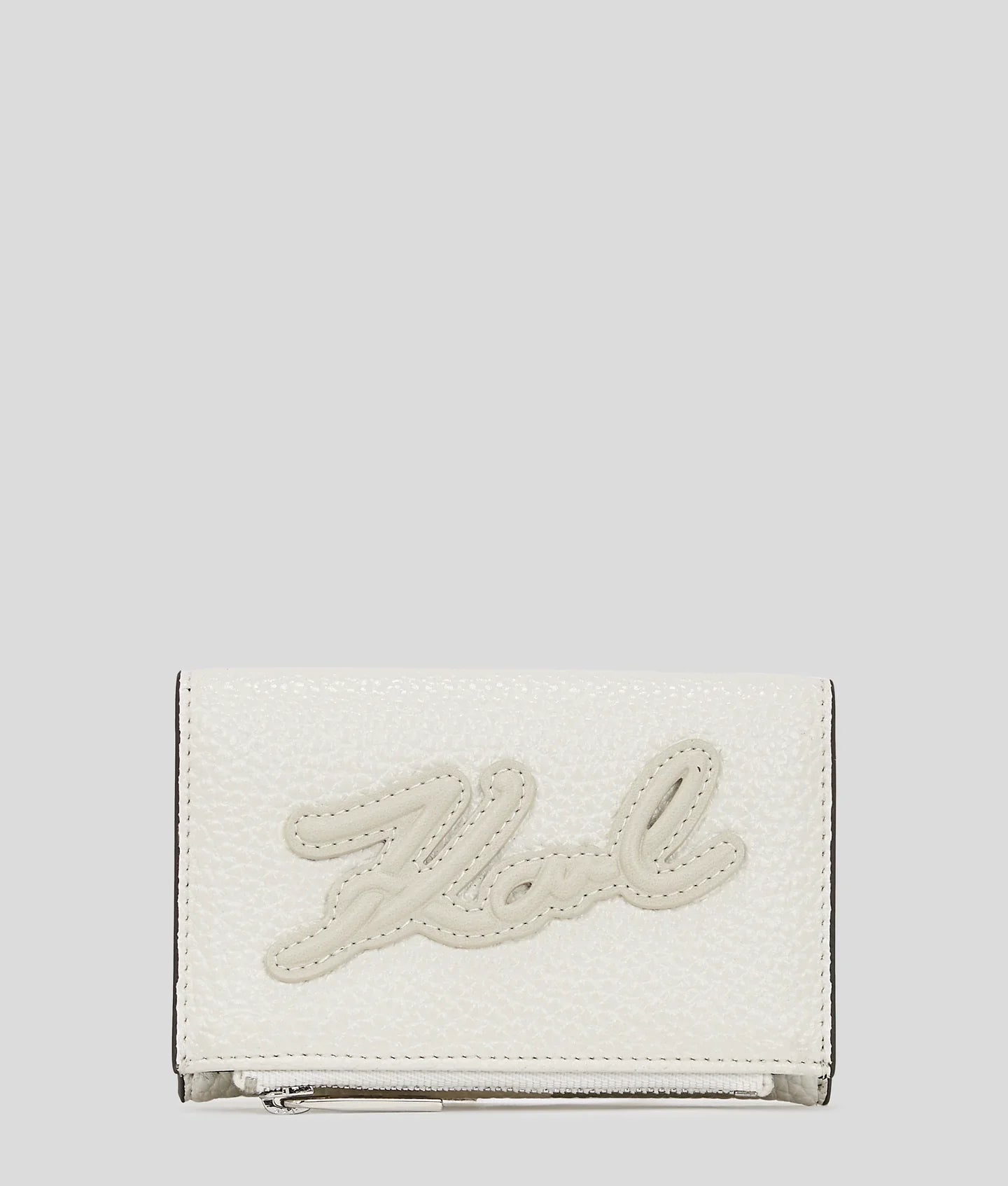 Introducing a petite bifold wallet that effortlessly combines style and functionality. It features a secure button closure, a zipped compartment and multiple card slots. Adorned with 3D Karl Signature artwork, it’s a statement accessory for any occasion.