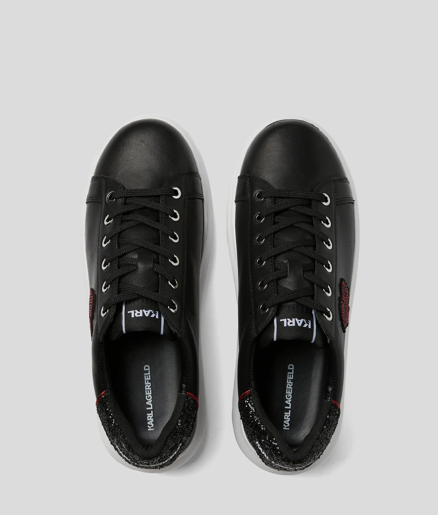 A playful rhinestone heart motif brings romantic charm to these sporty sneakers. The classic lace-up design features shiny metal eyelets and a glittery heel counter adorned with the KARL LAGERFELD logo, while the soft textile lining ensures comfort with every step.