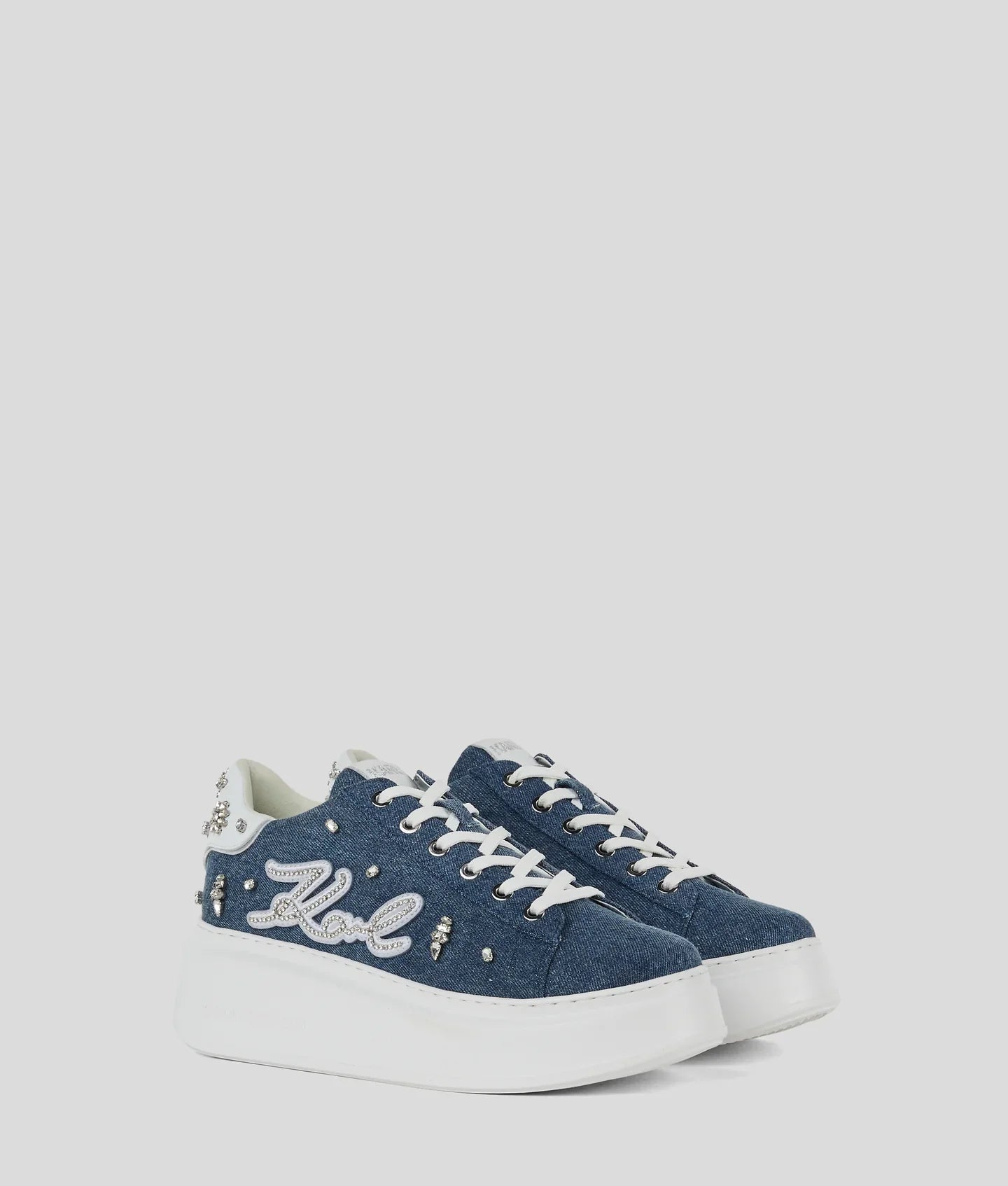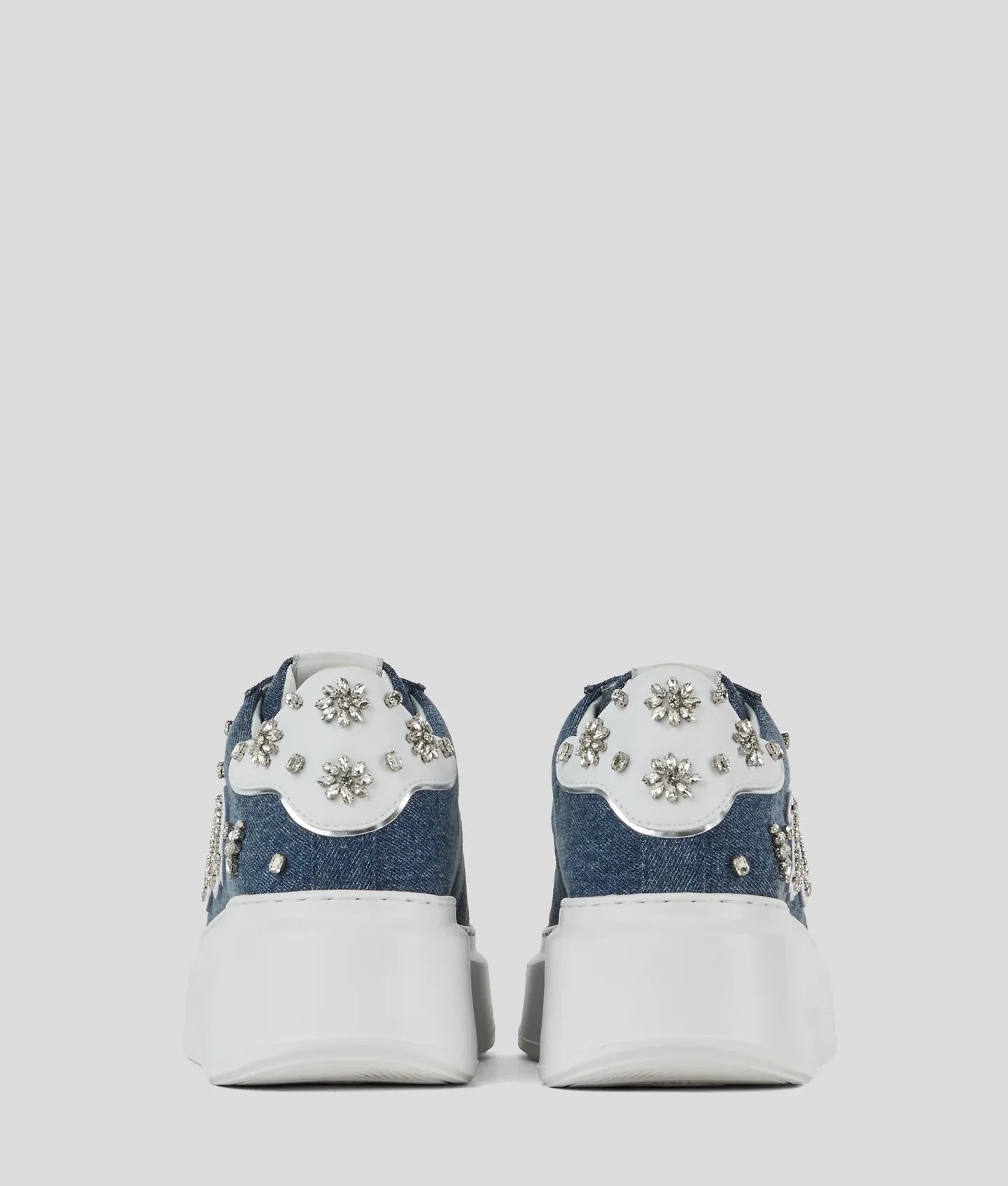 Light-washed denim meets playful embellishments in these statement sneakers. Glittering laces and a chunky wedge sole add bold finishes, while KARL Signature artwork cast in shimmering rhinestones enhances their eye-catching appeal.