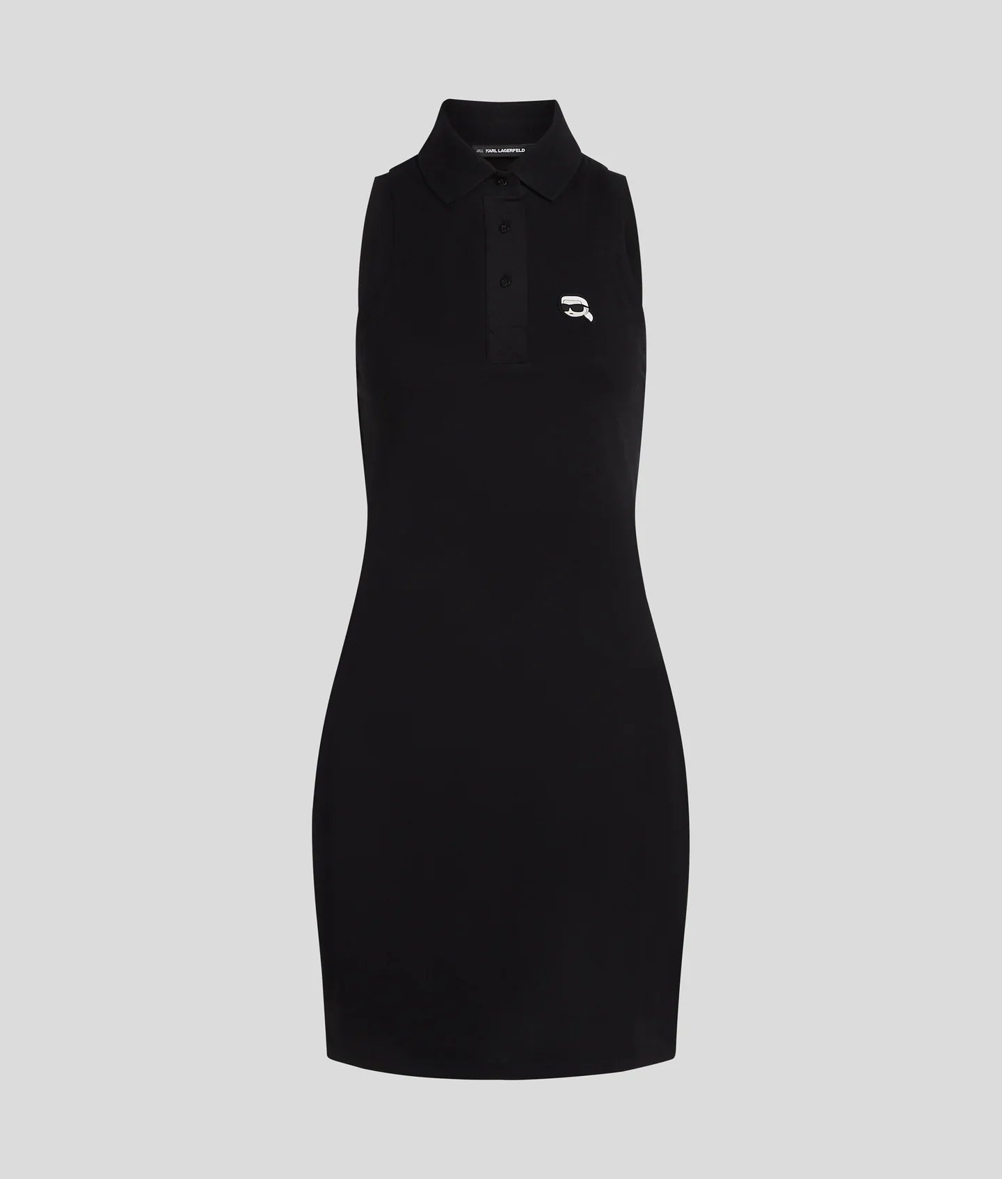 This sleek polo dress combines classic style with a modern edge. Its sleeveless, figure-hugging design enhances your shape, delivering a streamlined, flattering fit. A sharp pointed collar and three-button placket add sophistication, while the bold IKON artwork patch brings a statement finish, balancing elegance with a fresh, elevated style.
